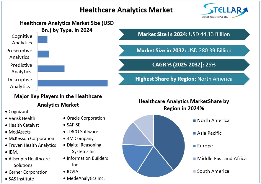 Healthcare Analytics Market size was valued at USD 44.13 Bn in 2024 and is expected to reach USD 280.39 Bn by 2032, at a CAGR of 26%.